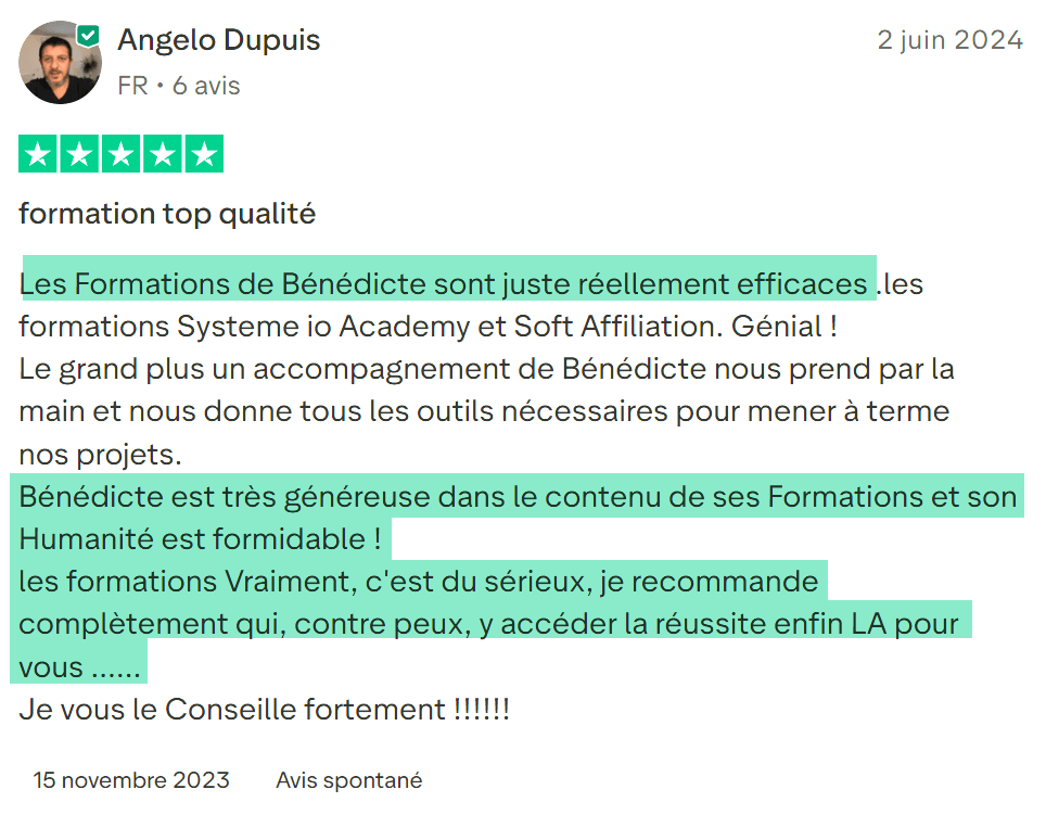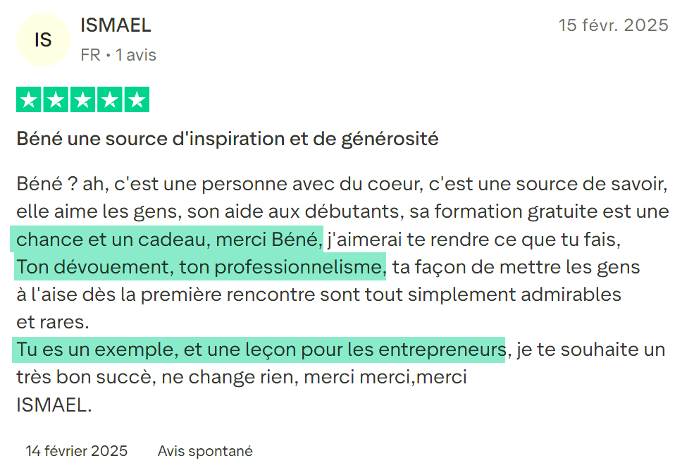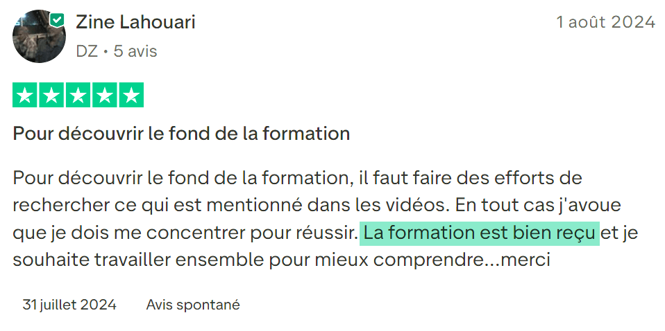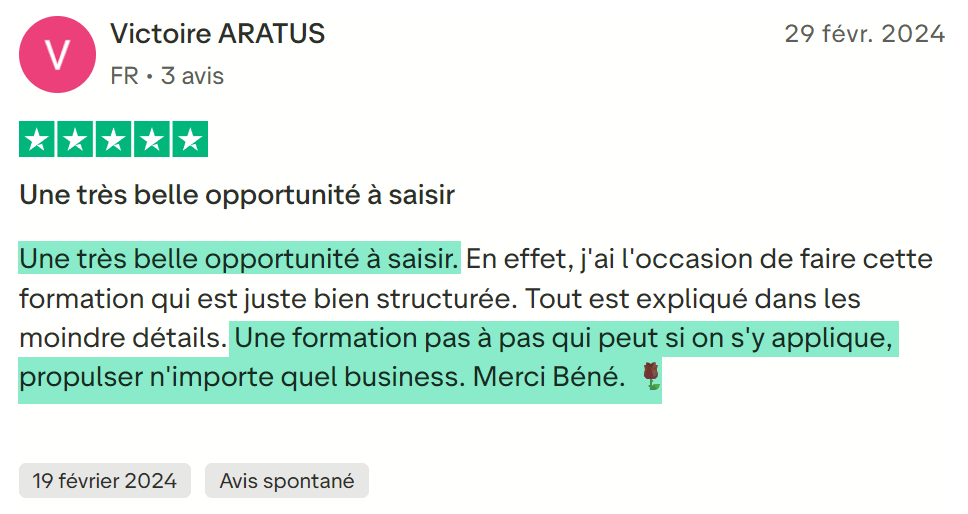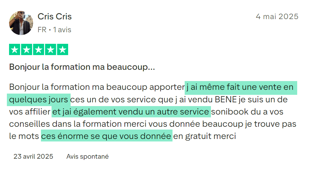 Si tu appliques sérieusement chaque étape de la formation sans procrastiner, tu devrais voir tes premiers résultats dans les 7 à 30 jours.