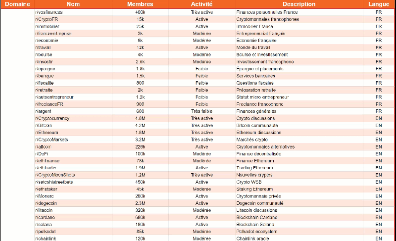 Reçois la liste de +400 communautés Subreddits sélectionnées pour leur qualité, leur activité et que j'ai classées par thématiques : Argent & Entrepreneuriat, Relations, Développement Personnel et Bien-être/Santé.